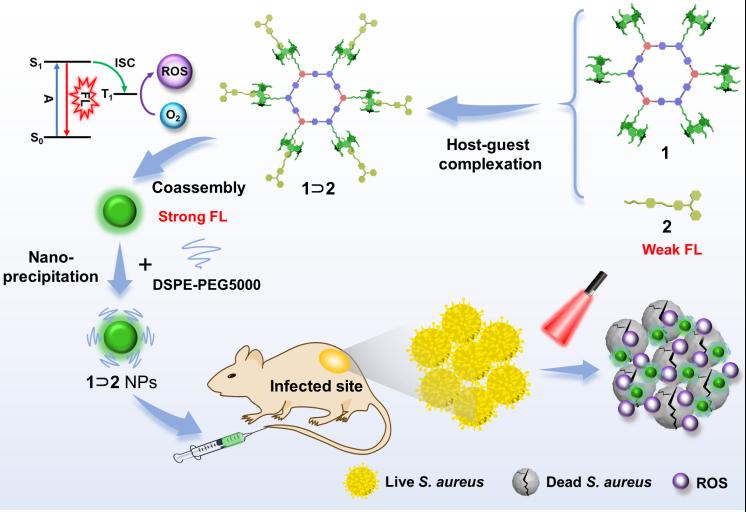 近日华中师范大学的孙耀课题组和犹他大学Stang教授课题组合作在病原菌的精准诊治方面取得了重要进展。抗菌药物滥用导致了细菌耐药已经对全球公共卫生安全构成了重大威胁。设计可快速标记、精准示踪病原菌感染的荧光探针,是减少抗生素滥用和实现病原菌精准诊治的前提。现有的有机小分子荧光探针在示踪过程中往往存在自身聚集导致荧光淬灭的现象,因而极大的干扰了荧光成像检测的精准度。孙耀课题组另辟蹊径从分子调控入手,设计柱芳烃修饰的超分子大环Pt作为主体分子(1),以荧光小分子作为客体分子(2),通过其主客体相互作用构筑了新型超分子荧光探针1⊃2。
