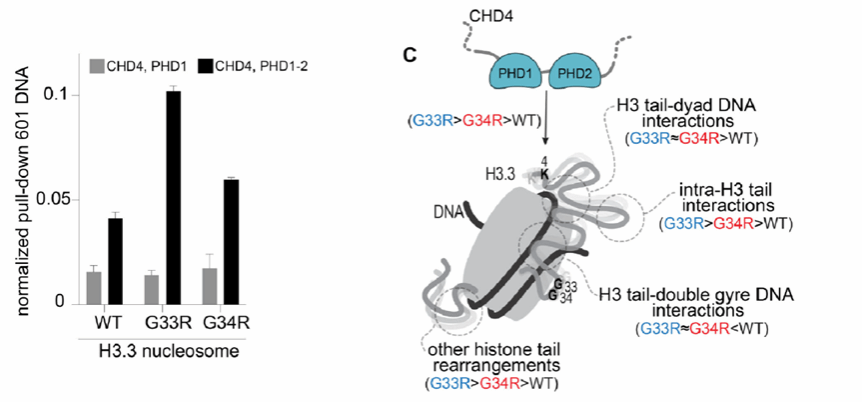 图1. H3.3 G34R突变调节组蛋白尾与DNA的结合模式、构象状态及 DNA 可及性,进而影响染色质重塑蛋白等调控因子的结合行为。