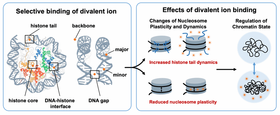 二价阳离子在染色质结构维持及其功能调控中发挥重要作用。作为染色质的基本结构单元,核小体对离子微环境变化高度敏感,其结构与物理化学性质可受到显著影响。尽管单价盐离子对核小体动态结构调控的研究已相对丰富,但从原子尺度系统揭示二价阳离子与核小体相互作用机制的工作仍然不足,尤其是二价阳离子如何调控核小体结构与动力学过程的物理机制尚不清晰。由于核小体具有显著构象柔性,且组蛋白尾部与 DNA 之间存在复杂静电相互作用,传统实验手段难以解析离子结合引发的细微结构与动力学变化,从而限制了对离子介导染色质可及性调控机制的深入理解。
