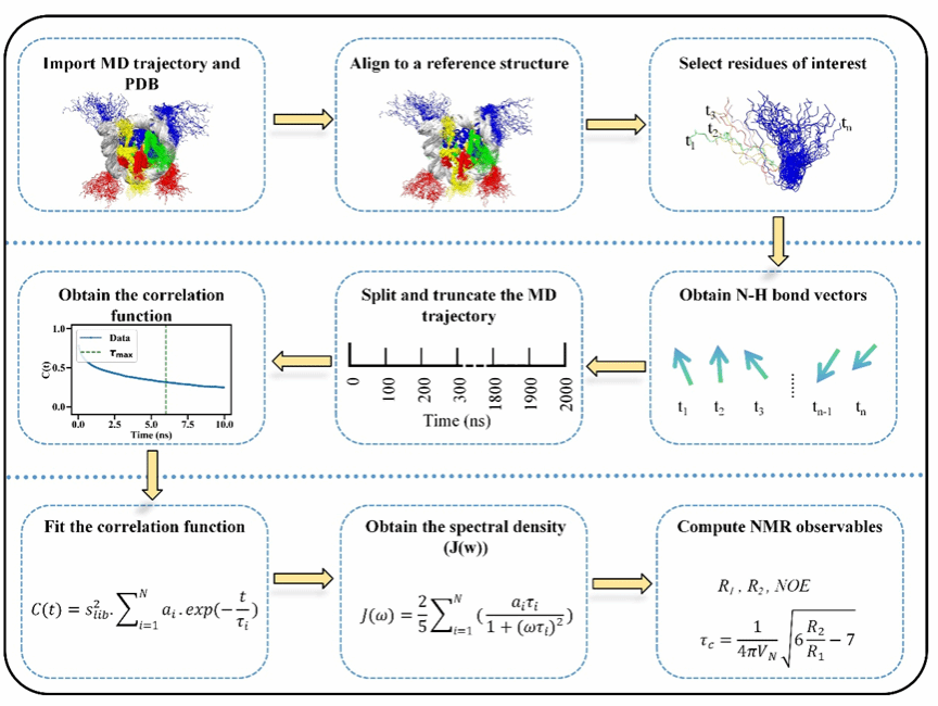 图3. MD2NMR工作流程示意图:从分子动力学轨迹出发,计算相关原子矢量的时间自相关函数,并通过多指数模型拟合获得谱密度函数;随后据此计算 NMR 弛豫参数,从而实现与实验NMR数据的直接比较。