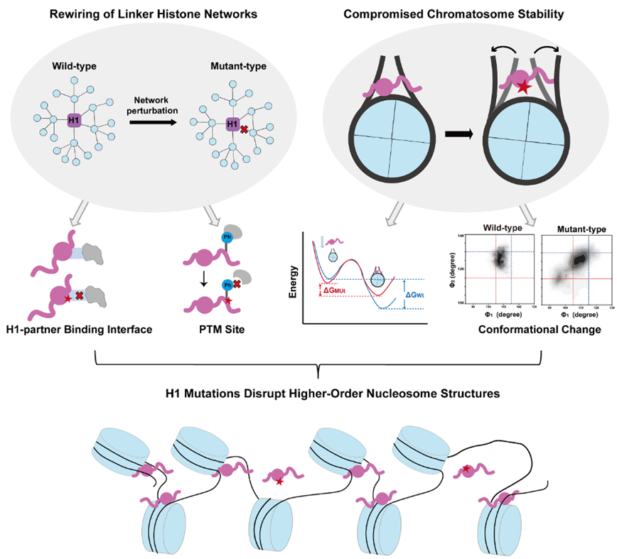 图2. 组蛋白H1突变通过重塑相互作用网络并降低H1-核小体复合物稳定性,进而导致染色质结构失调与表观遗传调控异常。