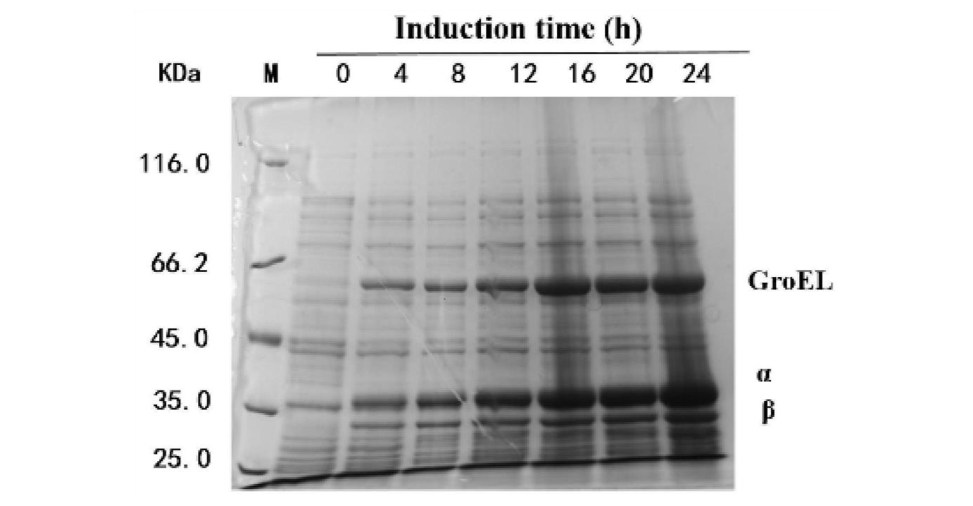 【成果简介】该成果涉及基因工程和酶工程技术领域,提供了一种制备异源四聚体α2β2型蓝藻PDHc E1的方法,包括:先分别制备蓝藻丙酮酸脱氢酶PDHc E1的α亚基和β亚基所对应的DNA片段,然后将α亚基对应的DNA片段和β亚基对应的DNA片段分别克隆到pETDuet‑1载体的多克隆位点1区域和多克隆位点2区域,获得重组质粒pETDuet‑1‑α‑β;再将重组质粒pETDuet‑1‑α‑β和伴侣蛋白表达质粒pGro7共转化到同一宿主细胞中,得到pETDuet‑1‑α‑β‑pGro7重组宿主细胞;最后进行通过宿主细胞的培养,蛋白诱导表达,菌体收集,超声波破碎等蛋白表达分离纯化流程,即可获得异源四聚体α2β2型蓝藻PDHc E1。该成果提供的制备方法不受生物组织的限制,操作简单、高效、制备成本低,获得的蓝藻PDHc E1产量高、纯度高、活性高。