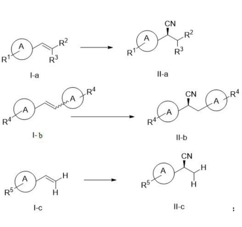 【应用背景】手性腈类化合物在合成化学中有着广泛的应用,在一定条件下可以转化为羧酸、酰胺、醛、酮类化合物和一些杂环化合物。此外腈类化合物在药物化学中也有着广泛的应用,是众多药物分子的合成前体,例如腈类化合物水解后得到的羧酸类化合物是一些常见的非甾体抗炎药的结构。因此对手性腈类及其衍生物的合成引起了越来越多有机化学工作者和药物化学工作者的研究兴趣。近些年来,过渡金属催化的不对称氰基化反应的研究不断发展,总体上还是面临着一些问题,比如苛刻的反应条件或是需要额外加入硅氢试剂等,而通过光催化与铜催化结合的方式来实现烯烃的不对称氢氰化的例子并未见报道。