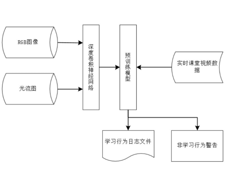 中国专利申请号201910674395.6公开了一种基于目标检测的学生课堂的人体行为识别方法,该方法可以识别端坐、书写、趴桌、左顾右盼、举手、起立等常见的课堂行为,但是忽略了课堂中存在的一些重要的非学习行为;而且该方法使用多管道的3D CNN网络作为基准模型进行训练和测试,虽在一定程度上减少了计算量,但不能进行实时的人体动作识别。