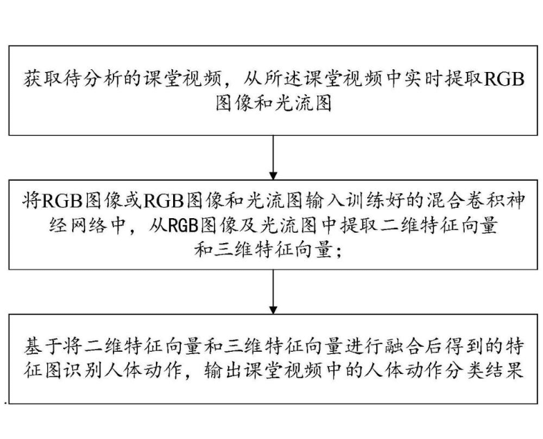 【成果简介】本申请公开了一种课堂实时人体动作识别方法、计算机设备及可读介质,该方法包括:从待分析的课堂视频中实时提取RGB图像和光流图;将RGB图像或RGB图像和光流图输入训练好的混合卷积神经网络中,获取课堂视频中的人体动作分类结果;混合卷积神经网络具有宽残差网络结构,包括二维卷积网络以及与所述二维卷积网络并联的三维卷积网络,分别从RGB图像及光流图中提取二维特征向量和三维特征向量;基于将二维特征向量和三维特征向量进行融合后得到的特征图识别人体动作;本发明结合了深度卷积神经网络、RGB图像和光流图,并使用高效的数据提取算法,不仅使人体动作识别的精度得到进一步提升,而且,实时的视频人体动作识别过程中不存在掉帧和卡顿现象。