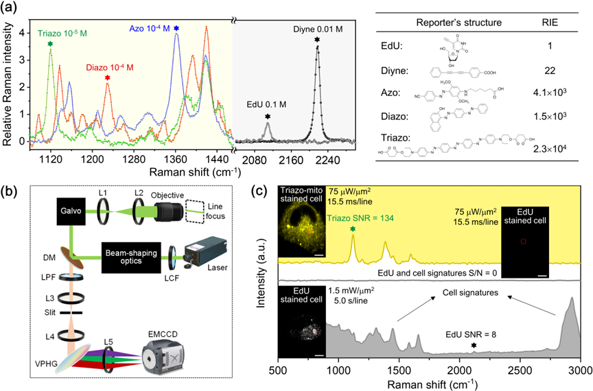 图1. DAERI的原理示意。(a)偶氮增强拉曼探针的结构与性质。(b)线扫描自发拉曼显微成像装置。(c)传统拉曼探针EdU与AERS探针Triazo细胞成像的灵敏度比较。