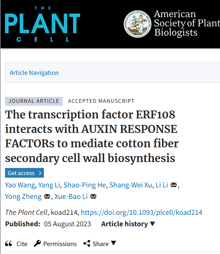 8月5日,植物学顶级期刊Plant Cell在线发表了华中师范大学生命科学学院分子遗传研究组题为“The transcription factor ERF108 interacts with AUXIN RESPONSE FACTORs to mediate cotton fiber secondary cell wall biosynthesis” (https://doi.org/10.1093/plcell/koad214)的研究论文,该研究揭示了AP2/ERF转录因子GhERF108与生长素响应因子GhARF7-1/7-2通过乙烯-生长素交互信号通路(ethylene-auxin signaling crosstalk)调控棉纤维SCW发育的新机制。
