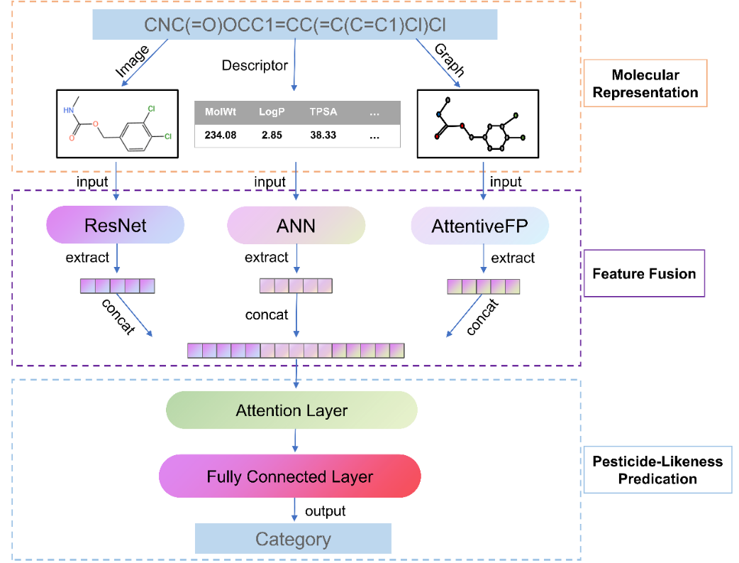 近日,我校绿色农药全国重点实验室杨光富教授和王凡副教授团队开发了一个预测类农药性的多模态深度学习架构模型Pesti-DGI-Net,该模型还提供了两种可解释性方法以帮助研究人员直观了解深度学习模型所关注的结构片段。相关成果以“Pesti-DGI-Net: A multi-modal deep learning architecture based on dual interpretability for pesticide-likeness prediction” 为题发表在农业工程领域权威期刊《Computers and Electronics in Agriculture》上。