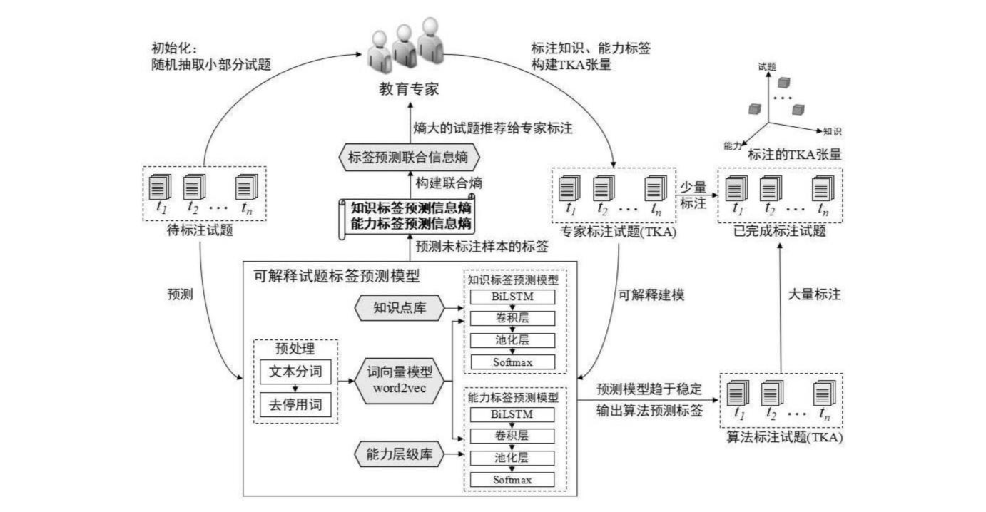 【成果简介】该成果属于教育数据挖掘技术领域,公开了一种面向知识测量的试题、知识、能力张量构建与标注方法,结合Q矩阵与布卢姆认知领域教育目标分类,将知识点的掌握划分为六个认知能力水平:知道、领会、应用、分析、综合、评价,构建试题、知识、能力张量;采用主动学习策略,构建可解释试题标签预测模型,获得可解释的标签预测信息熵,利用训练出的可解释试题标签预测模型,将未标注样本输入该预测模型,反馈具有较强解释性的标签预测信息熵,从而进行人机协同。该成果减少了人工标记的主观性对TKA张量的影响,标注准确率与效率高,极大降低专家人力成本。该成果可迁移性强,可应用于各个学科的试题知识点考查标注,方法适用性更好。