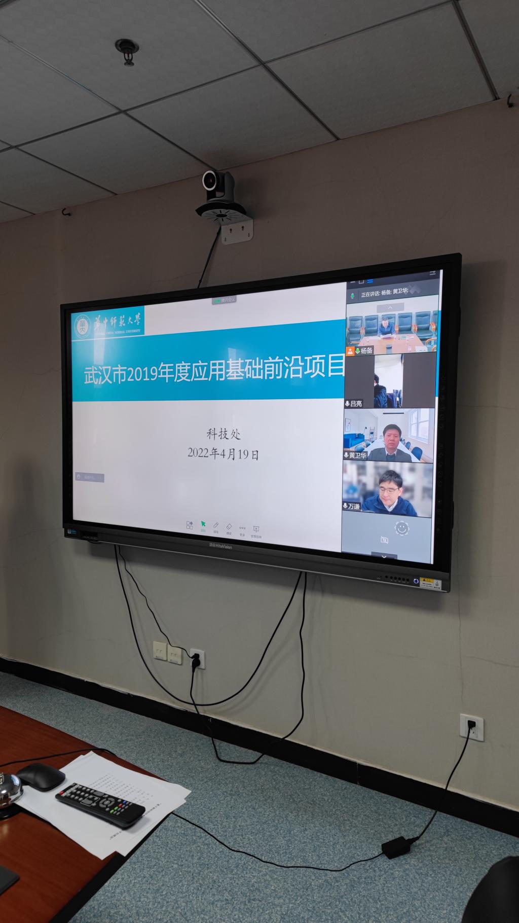(通讯员:王珏 杨备 摄影:裴蕾)4月19日,武汉市2019年度应用基础前沿项目视频验收会在化学学院L819会议室召开。武汉大学化学与分子科学学院黄卫华教授、华中科技大学同济医学院药学院副院长万谦教授、广州中医药大学刘芳教授以及华中师范大学高级会计师吕亮等4名专家对《高效克服多重耐药性的新一代 TRK 靶向抗肿瘤药物的发现》等三个项目进行了验收。会议由科技处副处长吴成峡主持。