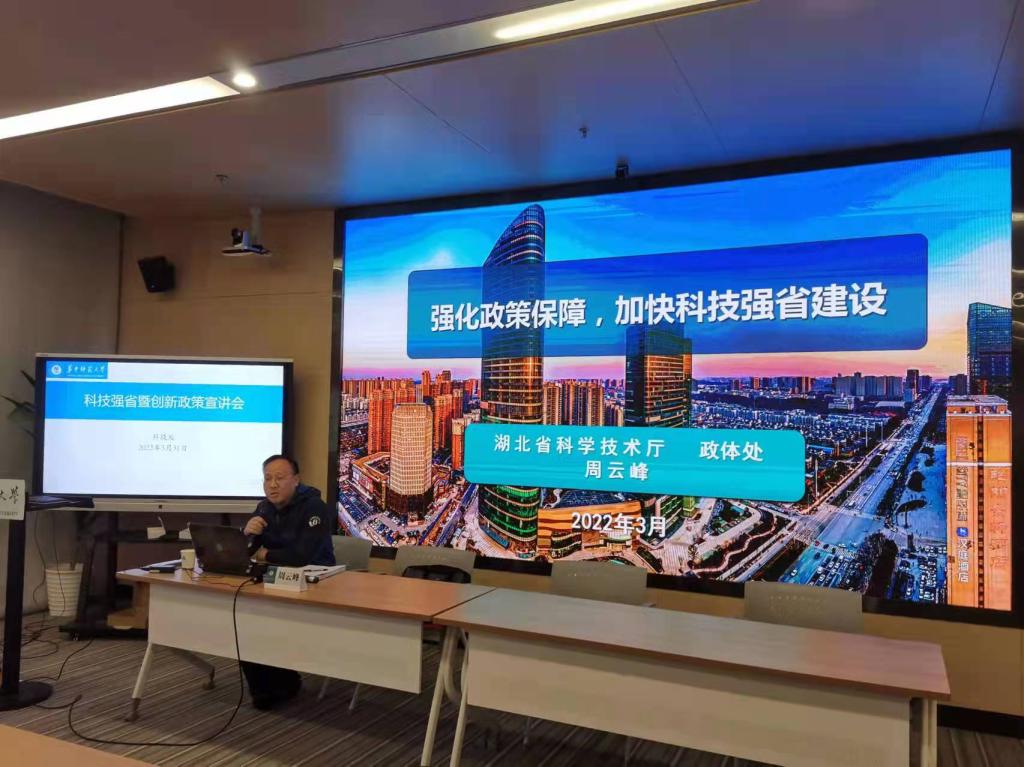 (通讯员:杨备 王珏)3月31日下午,科技强省政策宣讲座谈会在我校南湖综合楼1160会议室召开,省科技厅政体处二级调研员周云峰参加并作湖北省科技强省政策宣讲,省科技信息研究院战略管理研究所总监胡然出席会议,学校科技处、各学院院长、科研副院长、平台负责人及部分重大项目负责人参加会议。会议由科技处副处长吴成峡主持。
