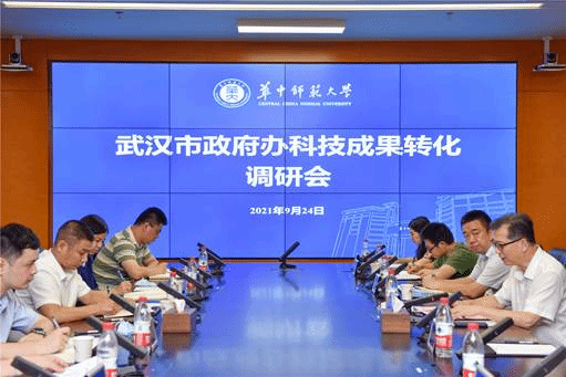 2021年9月24日,武汉市政府办公厅高校服务处徐国良处长一行5人来校调研科技成果转化工作。调研座谈会在南湖综合楼1182会议室举行,副校长彭南生出席座谈会。座谈会由科技处副处长吴成峡主持,武汉市科技局科技成果转化联络员、人工智能教育学部代表、化学学院代表参加座谈并发言。