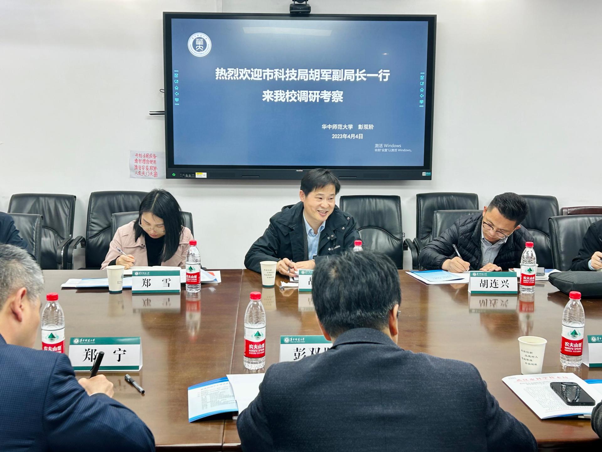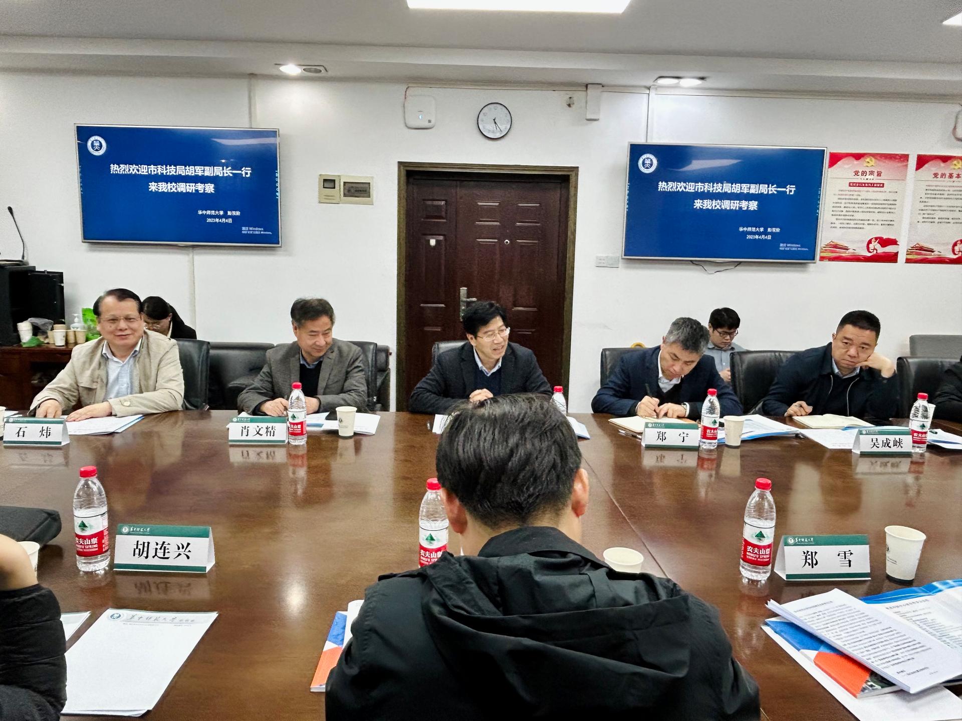 (通讯员 王珏 朱潇潇 吴涛)为贯彻落实全市科技创新大会精神,坚持创新在现代化建设全局中的核心地位,举全市之力推进武汉具有全国影响力的科技创新中心建设,市科技局副局长胡军一行7人,于4月4日下午来我校调研考察、与有关专家学者和领导座谈交流。副校长彭双阶出席座谈会并作重要讲话,座谈会由科技处副处长吴成峡主持。