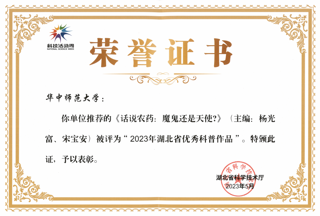 日前,湖北省科技厅公布了《2023年湖北省优秀科普作品公示名单》,我校杨光富教授和贵州大学宋宝安院士共同主编的《话说农药:天使还是魔鬼?》获评“2023年度湖北省优秀科普作品”。