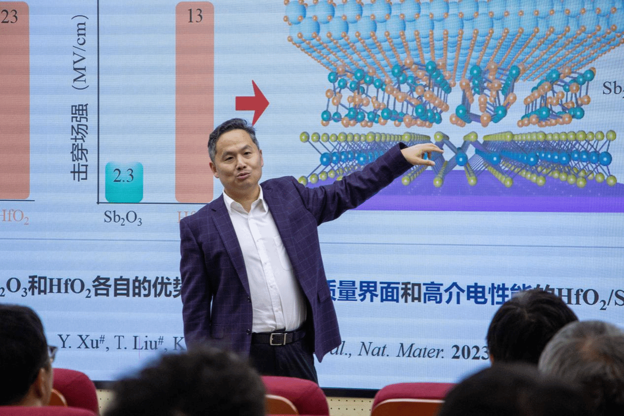 在“新应用”环节,翟教授讲述了氧化锑(Sb₂O₃)在器件领域的实践探索。团队利用该类晶体的结构特性,开发出高性能介电层材料,通过热蒸镀法制备晶圆级薄膜,有效减少载流子界面散射,使二维晶体管的迁移率显著提升、操作电压大幅降低;此外,该材料还可作为封装层,在保护易氧化材料稳定性方面表现突出,同时在离子迁移、数据存储等组变材料场景中也展现出应用潜力,目前已与合作实验室成功制备出8英寸相关器件。