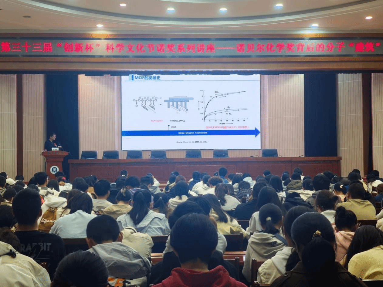 涂斌斌从2025年诺贝尔化学奖切入,介绍了奖项的授予背景与获奖科学家科研经历,并通过动态视频生动展示了金属有机框架材料(MOF)的结构特征。他从MOF的发现、命名到实际应用系统梳理了其发展脉络,深入剖析了三位获奖科学家的关键贡献,并对比了MOF与传统材料的优势。围绕MOF的材料特性,涂斌斌详细阐释了其超高比表面积、结构多样性等特点,结合典型应用场景介绍了MOF材料的实际应用与产业化进展。在互动环节,同学们围绕“MOF与超分子的关系”“应用难点”等问题积极提问,涂教授逐一作出细致解答,进一步加深了听众对相关知识的理解。